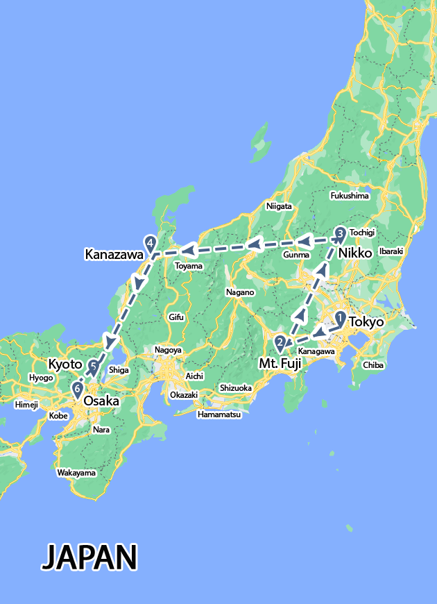 • Cities: Tokyo, Nikko, Takayama, Kanazawa, Kyoto, Osaka